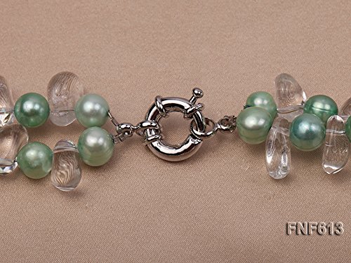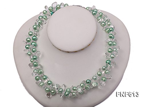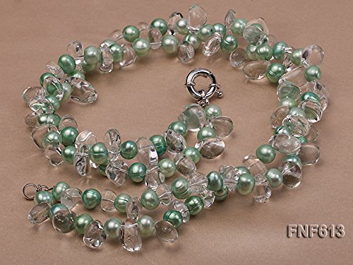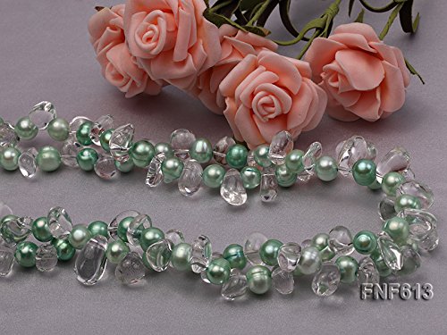 This is a beautiful two-strand necklace set with 6x7mm light-green flat side-drilled cultured freshwater pearls and 8x14mm white baroque side-drilled crystal.