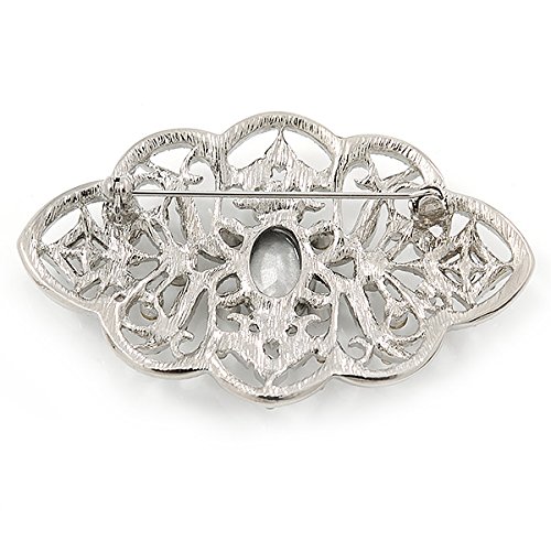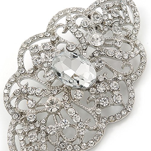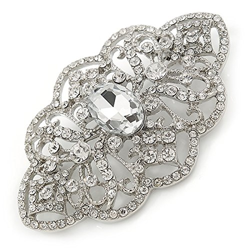 Jazz up your look with this stunning Bridal/ Wedding/ Prom Art Deco Clear Austrian Brooch In Rhodium Plating. Featuring an Art Deco design, crafted in rhodium plated finish and decorated with sparkling crystals in hues of clear, offering a dazzling look. The piece measures about 63mm L x 40mm W, and fastens with a flag pin and revolver. It's the perfect way to dress up your outfit if you're going out for the night.Feature