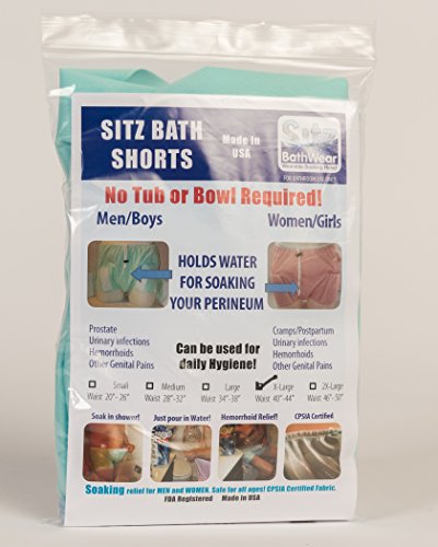 Studio : Sitz BathWear, LLC Publisher : Sitz BathWear, LLC Binding : Health and Beauty Product Description These re-usable and FDA registered garments are for soaking your perineum or private area in the shower, or by pouring in warm water and/or Essential Oils/Epsom Salt. No tub or awkward plastic bowl is required. For Women: Cramps, Postpartum, Hemorrhoids, other Genital pains. For Men; Prostate issues, Hemorrhoids, Other Genital pains. Made in USA. Suction Hook included for Hanging on Shower Wall. 0