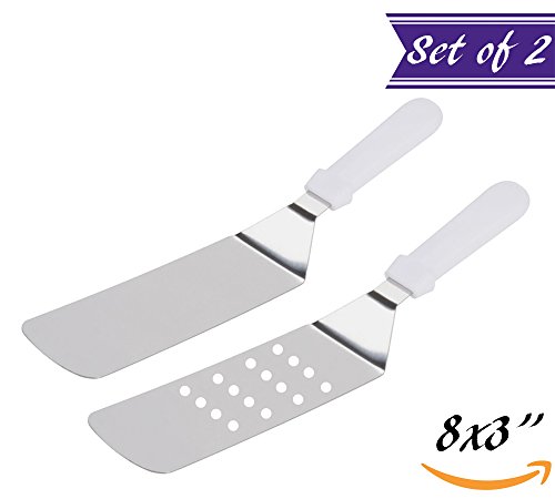 Turner Spatula Set by Tezzorio Flexible Burger Turners with Plastic Handles for Griddle Grill, Stainless Steel Spatulas for Professional Cooking 8-Inch by 3-Inch
