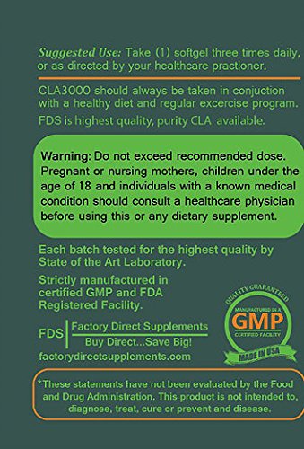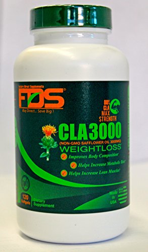 -. Binding : Health and Beauty -. Brand : FDS Factory Direct Supplements -. EAN : 0702921999950 -. Feature : 80% CLA Max Strength / CLA 3000 WEIGHT MANAGEMENT SUPPLEMENT: CLA promotes healthy fat loss by increasing your body's metabolism without added stimulants. Keep the muscle; lose the fat with CLA 3000. Labs research clinical trials sest CLA may reduce body fat mass. CLA 3000 is derived from safflower oil, and is great for weight loss support at any time of the year! Along with a healthy diet & exercise program, CLA helps promote lean body fat reduction. / Strictly manufactured in certified GMP and FDA registered facility NO SIDE EFFECTS - MADE IN USA - 100% NATURAL BEST CLA: Endorsed by doctors on TV, this all natural weight loss supplement (the best fat burners for women & men) is 80% pure cla max stength with NO fillers, binders or artificial ingredients. / 100% SATISFACTION GUARANTEE: Lose weight with our Cla for Weight Loss or your money back! Order Yours Today! / 2350 Mg of CLA per serving. Derived from non-GMO safflower oil. -. IsAdultProduct : 0 -. Label : FDS Factory Direct Supplements -. Manufacturer : FDS Factory Direct Supplements -. MPN : FDS -. PackageQuantity : 1 -. PartNumber : FDS -. ProductGroup : Health and Beauty -. ProductTypeName : HEALTH_PERSONAL_CARE -. Publisher : FDS Factory Direct Supplements -. Studio : FDS Factory Direct Supplements -. Title : FDS CLA 3000, 120 capsules -. UPC : 702921999950