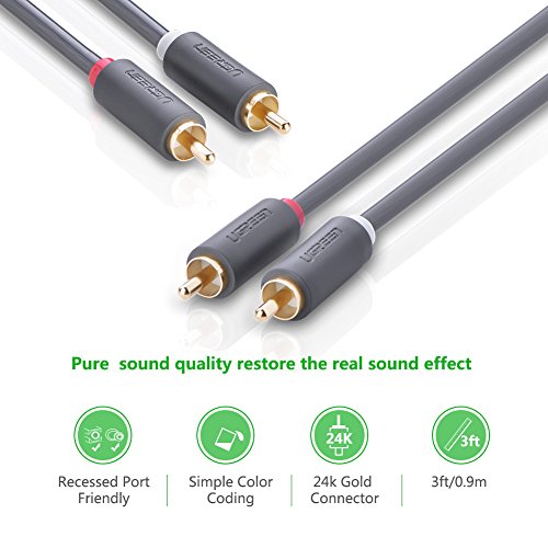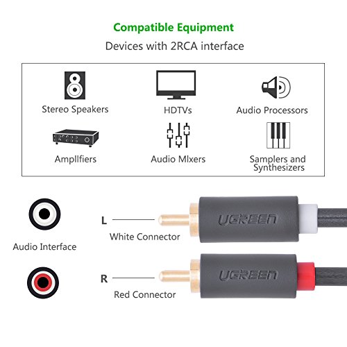 Description Ugreen 10518 6ft/2m 2RCA Male to 2RCA Male Stereo Audio Cable are good choices for home theater, HDTV, gaming consoles, hi-fi systems by amplifying sound quality for a more enjoyable audio experience. Gold plated connectors are for improved audio/video signal transfer and less signal interference. RCA is a great alternative for audio/video applications where newer connection types are not available.