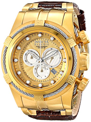 -. Feature : Chronograph functions with 60 second, 30 minute and 1/10 of a second light silver sub dials; date window between 4:00 and 5:00; invicta reserve 5-year warranty included with shipment / Gold textured dial with silver tone, gold tone and white hands, silver tone and white hour markers; luminous; unidirectional 18k gold ion-plated stainless steel bezel with stainless steel wire accent; screw-down crown; flame fusion crystal; 18k gold ion-plated stainless steel case with stainless steel wire inserts; brown leather strap / Swiss-quartz movement / Case diameter: 52mm / Water resistant to 660 feet