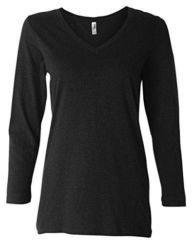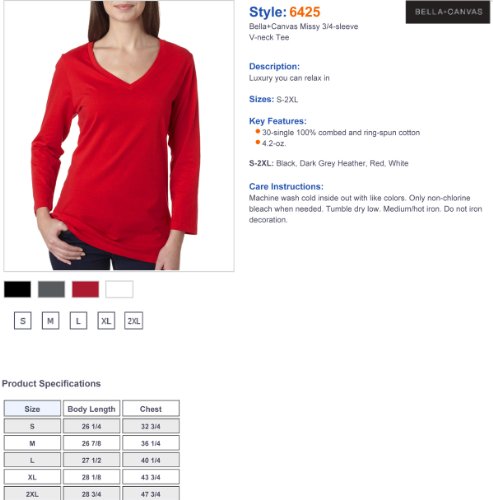 Binding : Apparel Product Description 6425 Bella Canvas Missy Jersey 3/4-Sleeve V-Neck Tee A sassy V-neck, tri-blended for that amazingly soft feel. solid colors: 100% combed and ring-spun cotton 4.2 oz. solid colors and dark grey heather 3.8 oz. triblend colors 30 singles; dark grey heather: 52% combed and ring-spun cotton/48% polyester 30 singles; triblend colors: 50% polyester/25% combed and ring-spun cotton/25% rayon 40 singles; 3/4-sleeve missy fit Sizes: S-2XL 0