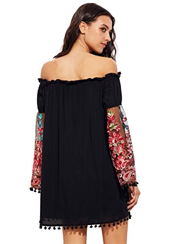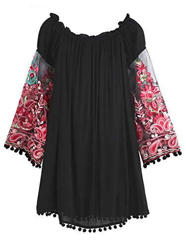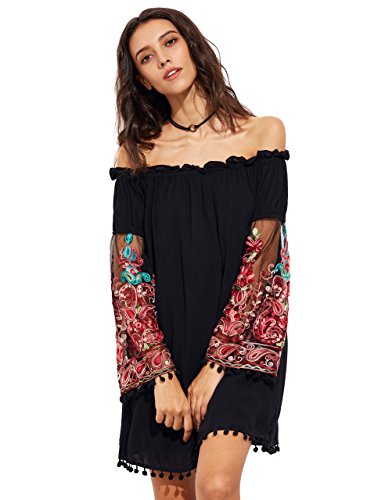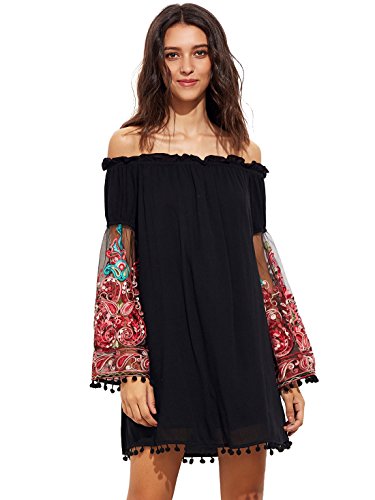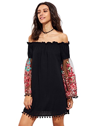 Elastic band on shoulder, off the shoulder, floral sleeve, long sleeve, tassel hem, lined, not see through.