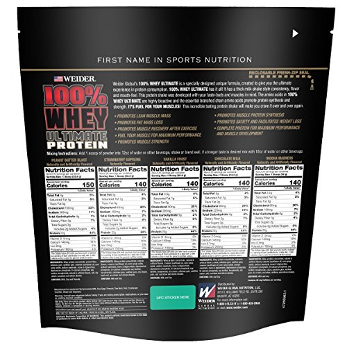 ReleaseDate : 2016-01-06 Studio : Weider Global Nutrition Publisher : Weider Global Nutrition Binding : Health and Beauty Product Description Weider Global's Whey Ultimate is a specially designed unique formula, created to give you the ultimate experience in protein consumption. WHEY ULTIMATE has it all! It has a thick milk-shake style consistency, flavor and mouth-feel. This protein shake was developed with your taste-buds and muscles in mind. WHEY ULTIMATE contains a blend of highly bioactive amino acids and is a rich source of essential branched amino acids which promote protein synthesis and muscle strength. It contains 22 grams of protein per serving for maximum performance, promote muscle protein synthesis, muscle development, and muscle strength. IT'S FUEL FOR YOUR MUSCLES! This incredible tasting protein shake will make you crave it over and over again. Promotes lean muscle mass Promotes fat mass loss Promotes muscle recovery after exercise Fuel your muscle for maximum performance Promotes muscle strength Promotes muscle protein synthesis Complete protein for maximum performance and muscle development Promotes satiety and facilitates weight loss 0