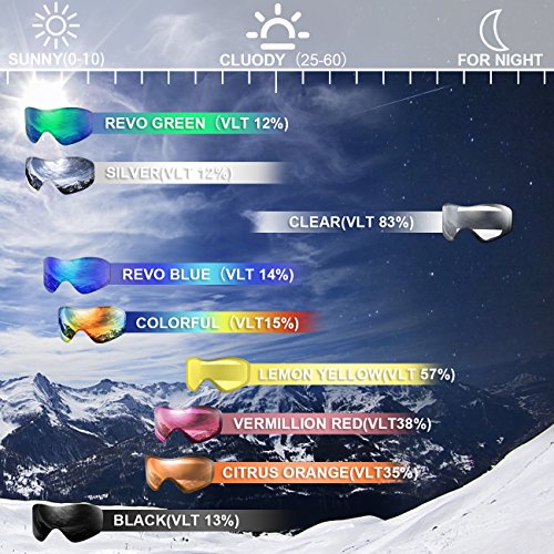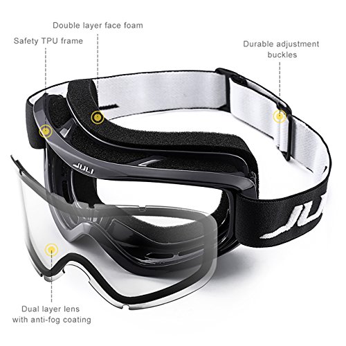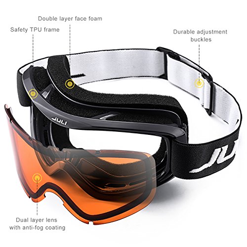 -. Feature : PROFESSIONAL VENTILATION- Designed to reduce fogging and optimizes the flowing air over the inside of the lens. ski goggles provide smooth air-flow system which brings fresh air and exhaust moisture quickly and effectively. / HELMET COMPATIBLE ADJUSTABLE STRAP- The extra long elastic strap for any helmet compatibility.It makes these the perfect goggles suitable for both men, women & youth. Padded with an adjustable strap, these goggles are also suited for most ages and head sizes. / OTG SKI GOGGLES FOR MEN & WOMEN- Unisex Snow Goggles for Men, Women & Youth that can be worn over prescription glasses. Designed with performance and versatility in mind. / COLOR OPTIONS FOR EVERYONE- Available in a variety of different styles and colors, these are the perfect goggles not only for skiing & snowboarding, but also works great for All-Terrain Vehicle(ATV) snowmobile and snocross,gliding,skating. / 30 DAY MONEY BACK GURANTEE- All JULI customers enjoy 30 Day Money Back Guarantee. Customers can return and get refunded in case the purchasing is not satisfactory for any reason. You have no risk to try.