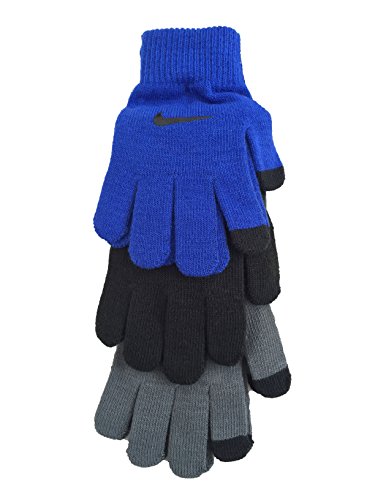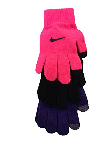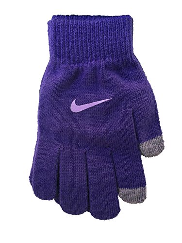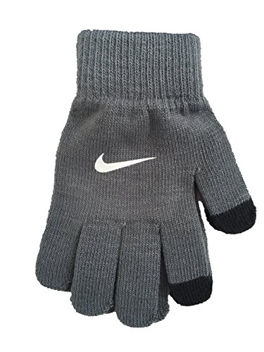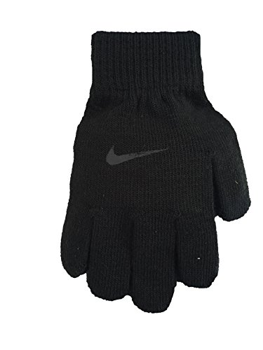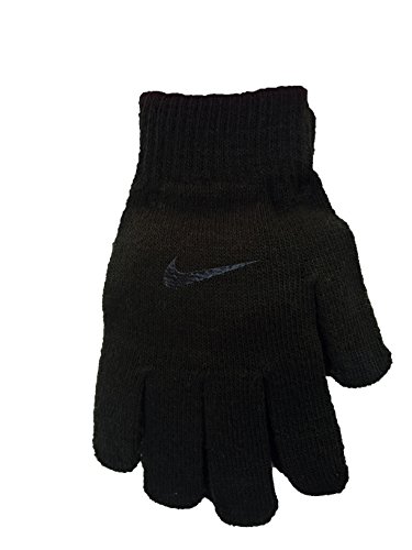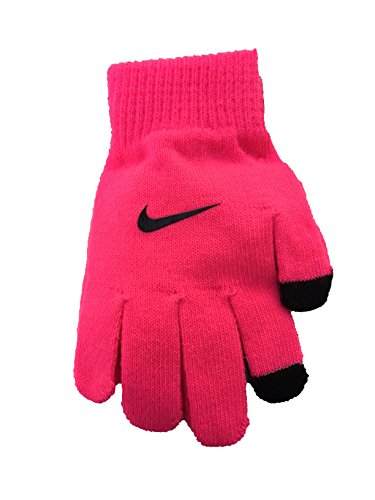 Binding : Apparel Product Description Warm knitted fabric locks in heat for toasty comfort. The combination of soft acrylic and the reinforced thumb and forefinger areas means these will provide comfort and durability through this winter season and beyond. The rib cuffs lock in heat and equal a snug fit while the iconic Swoosh logo finishes off this cold weather accessory. Embroidered Nike logo on backs of hands and touch screen capable thumb and pointer finger Nike Girls Tech Gloves Black 0
