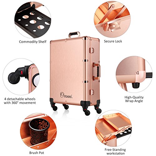Ovonni LED Makeup Train Case, Lighted Rolling Travel Portable Cosmetic Organizer Box with Mirror & 4 Detachable Wheels, Professional Artist Trolley Studio...