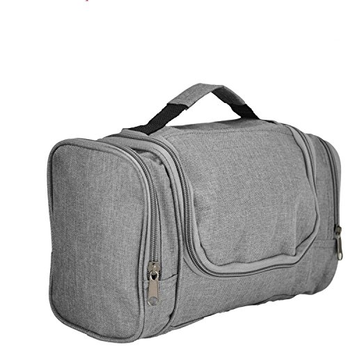 - Wide open main compartment with plastic covered multi-purpose organizers, 2 side zippered compartment, extra hanging hook and toothbrush holder