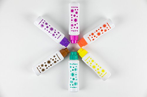 - NO CUPS, NO BRUSH, NO MESS, washable dot markers are easy set up clean up. Comes with 6 non-toxic Island Bright colors Lavender, Sea Foam, Coral, Lemon, Magenta, and Cinnamon Brown in no spill, no splash bottles.