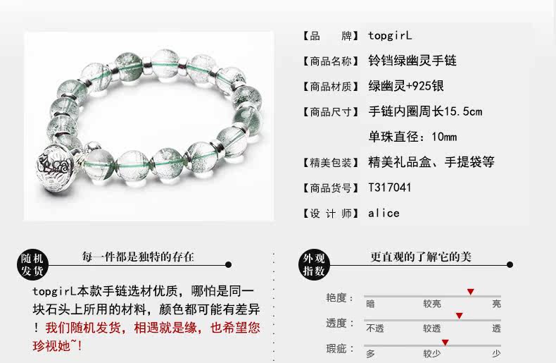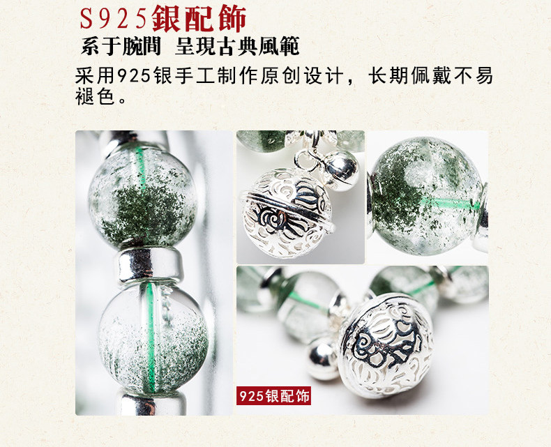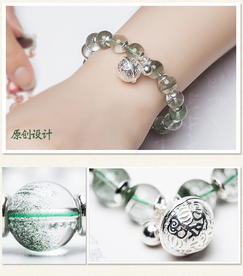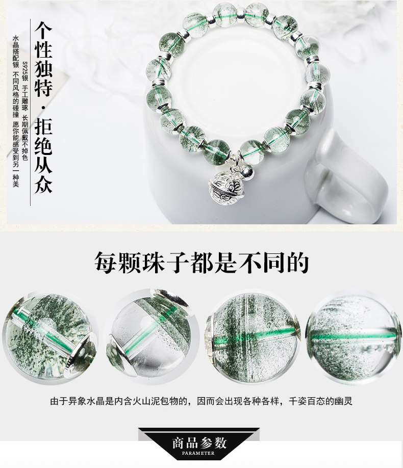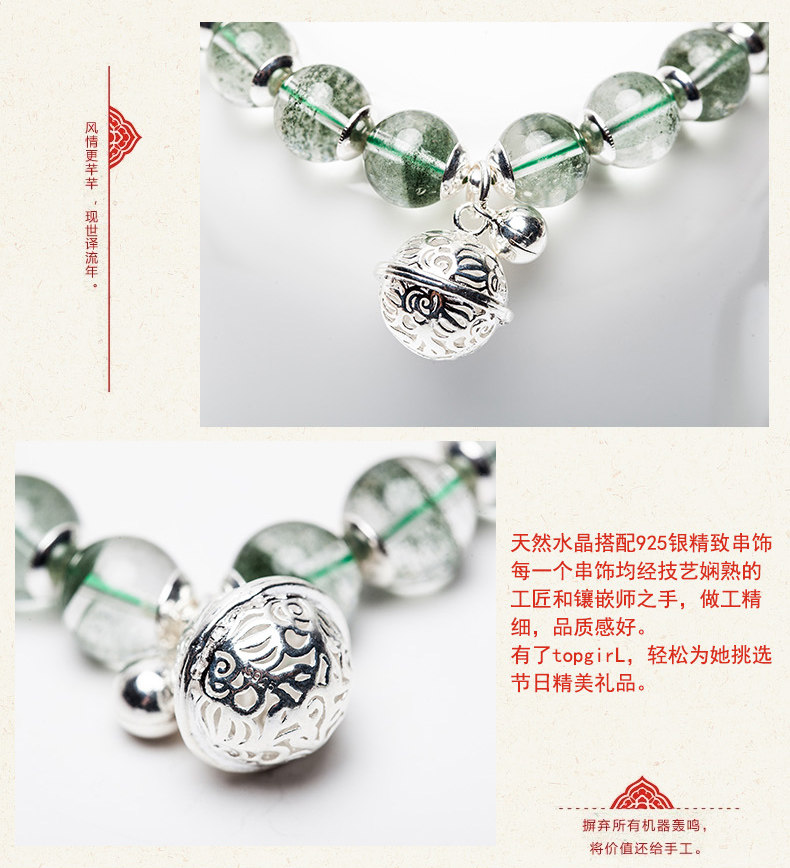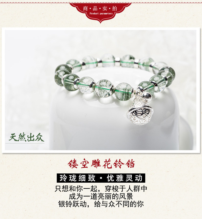 天然绿幽灵水晶手链女串珠925银配饰品铃铛520送女友