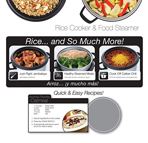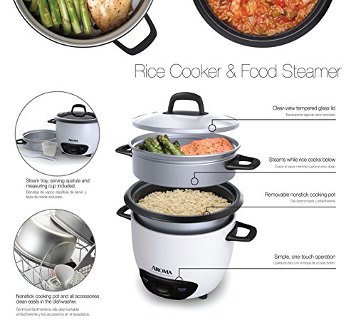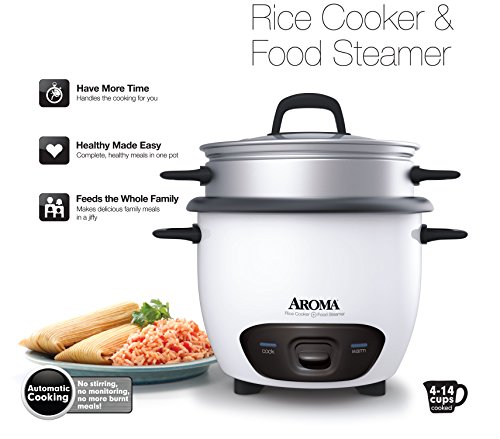 Enjoy easy home cooking with the Aroma 14-Cup (Cooked) Pot Style Rice Cooker and Food Steamer. Restaurant-quality rice. Healthy steamed meals. Delicious one-pot dishes. Prepare all this and more at the flip of a switch! Aroma takes the "cook" out of home cooking - turning kitchen time into your time! Help the kids with homework, get creative at play time or pick up that novel you've been waiting to dive into. All while delivering hot, hearty and healthy meals the entire family will love. This convenient cooker's large capacity perfectly cooks 4 to 14 cups of any variety of rice. Once the rice has finished, it will automatically switch to Keep-Warm so there's no need for monitoring or stirring. The Steam Tray allows for healthy steaming of meats and vegetables, even as rice cooks below. It's also perfect for oatmeal, chili, jambalaya, soups and so much more! And when the cooking is done, the inner cooking pot and all accessories remove for easy cleanup in the dishwasher. Steam Tray, Rice Measuring Cup and Serving Spatula included.Feature