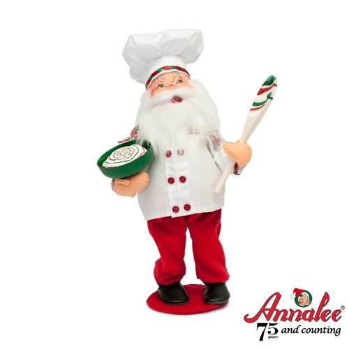 - Santa Chef in his chef hat holds a spoon covered in his baking batter and a pan with his goodies