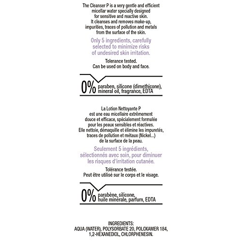 -. Binding : Health and Beauty -. EAN : 3700880000134 -. Feature : Very Pure Micellar Water for Gentle Skin Cleansing. / Hypoallergenic: 0% fragrance, 0% paraben, 0% EDTA. Only 5 carefully selected ingredients to respect sensitive and reactive skin. / Can help blemish-prone skin. Can be used as gentle makeup remover. / Remove impurities from skin, including traces of Nickel and Chromium. / Efficacy and tolerance tested. -. Label : Skintifique -. Manufacturer : Skintifique -. Model : 15775A -. MPN : SKP1300003 -. PartNumber : SKP1300003 -. ProductGroup : Health and Beauty -. ProductTypeName : HEALTH_PERSONAL_CARE -. Publisher : Skintifique -. Studio : Skintifique -. Title : Cleanser P - Cleanse and Purify Sensitive and Allergic Skin, Remove Frequent Irritant From Skin