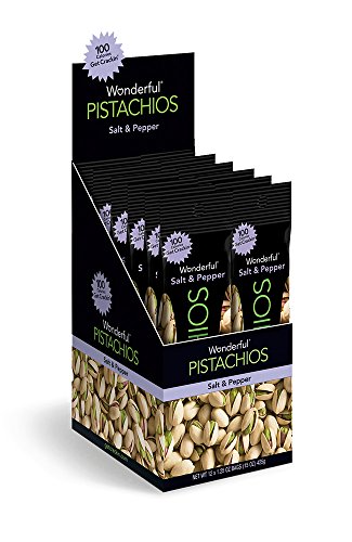 -. Binding : Grocery -. Brand : Wonderful Pistachios -. EAN : 0014113913324 -. Feature : Pack of 12 individual 1.25-ounce bags of our Wonderful Salt and Pepper Pistachios. / We've added a dash of salt and pepper to our classic roast for a taste that can't be beat. / Wonderful Pistachios are California-grown in our very own orchards. / Pistachios are a good source of fiber and protein, which makes them perfect for everyday snacking and entertaining. / Get crackin' with Non-GMO Project Verified Wonderful Pistachios today. -. IsAdultProduct : 0 -. Label : Wonderful Pistachios -. Manufacturer : Wonderful Pistachios -. NumberOfItems : 12 -. PackageQuantity : 12 -. ProductGroup : Grocery -. ProductTypeName : GROCERY -. PublicationDate : 2013-06-10 -. Publisher : Wonderful Pistachios -. Size : 1.25 Ounce (Pack of 12) -. Studio : Wonderful Pistachios -. Title : Wonderful Pistachios, Salt and Pepper, 1.25-oz Bags (Pack of 12) -. UPC : 014113913324