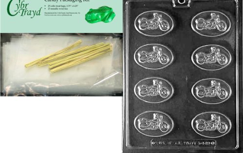 Cybrtrayd Mdk25G-K149 Motorcycle Pieces Kids Chocolate Candy Mold with Packaging Bundle, Includes 25 Cello Bags, 25 Gold Twist Ties and Chocolate Molding Instructions