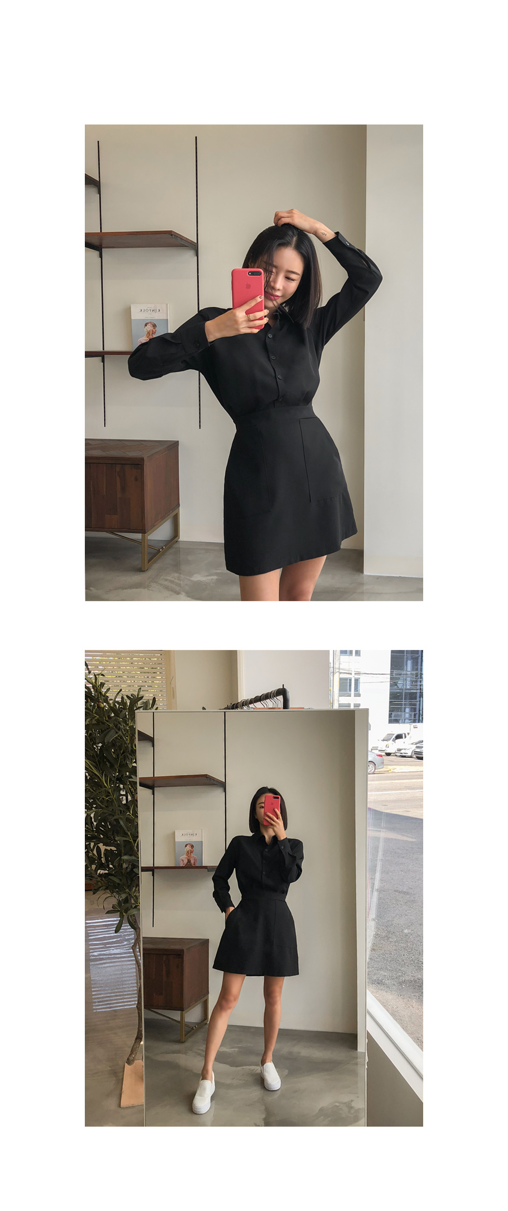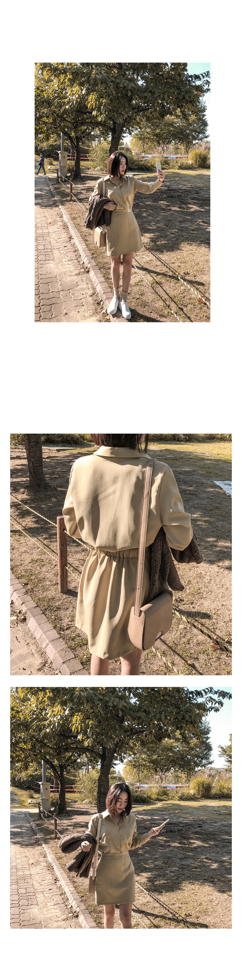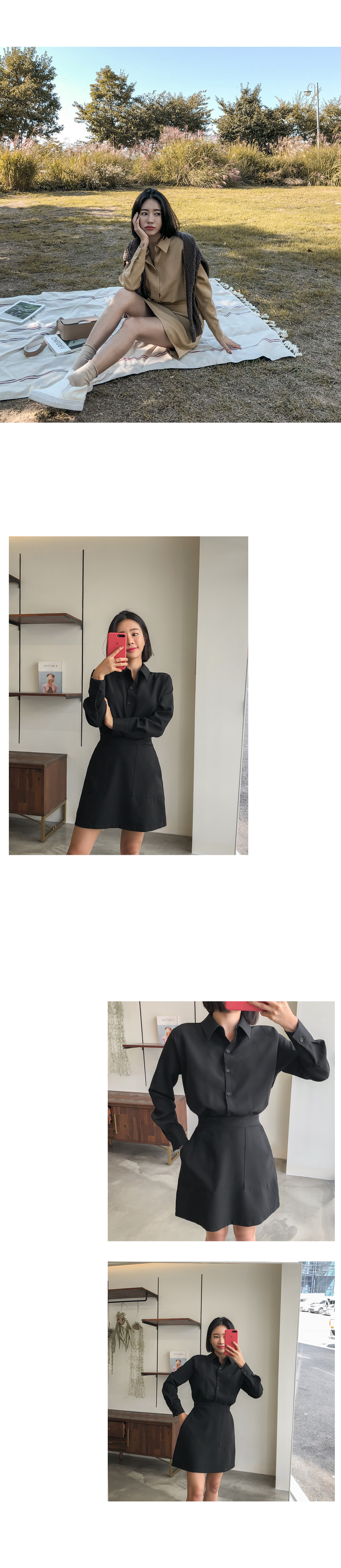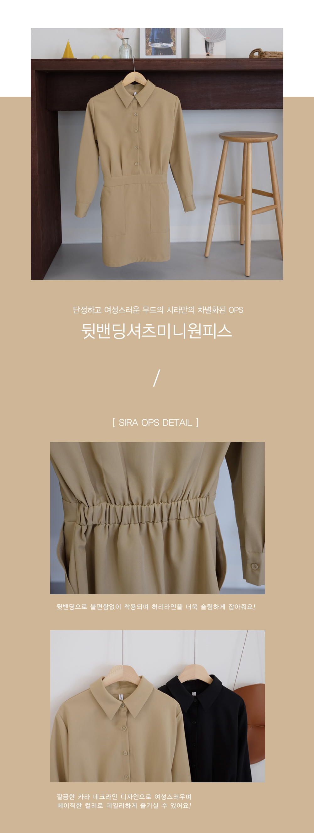 단정하고 여성스러운 무드의 뒷밴딩 셔츠 미니원피스