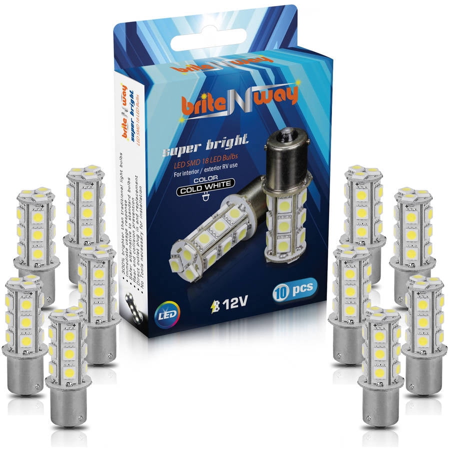 BriteNways LED bulb is the go-to replacement for standard incandescent bulbs illuminating your vehicles interior and exterior auto parts. The popular 1156 model type is manufactured to fit vehicle tail lights, reverse lights, brake lights, turn signal and side marker lights. Each bulb features an 18-count LED influx for maximum light emission which creates a 360-degree viewing angle. The solid state circuitry offered via LED lighting guarantees durability while utilizing low electrical power intake and emitting light which is 300 percent brighter than traditional bulbs. Its 13-lumen capacity produces maximum color brightness with reduced hot spots, the ultimate in lighting solutions. It has an eco-friendly bonus of low heat exposure and mercury free emittance. With a usage of 60k hours and an easy fit installation via the BA15S socket adaptor, youll be glad you tried the brighter way today. BriteNway 1156 BA15S LED Wedge Type Replacement Bulb for RV Camper, 18 SMD 5050, Cool Cold White, 10pk: