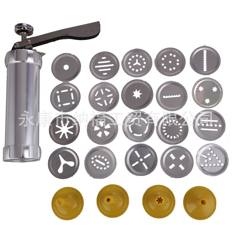 Include 3 parts: Cookie press machine; 20 different flower pattern pieces; 4 different mounted flower mouth