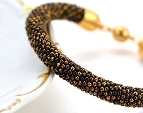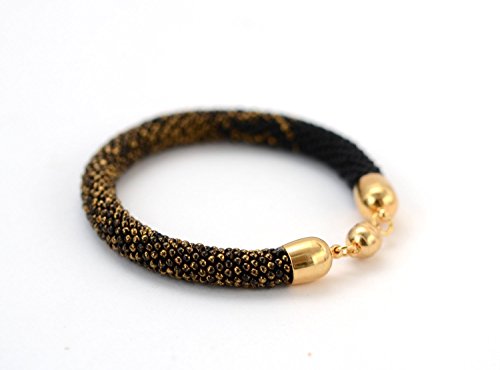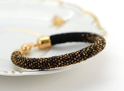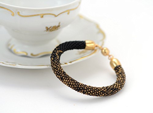 -. Title : 24K Gilded Marble Black Beaded Bracelet - Bead Crochet Bracelet - Bangle Bracelet - Beadwork Bracelet Beadwork Jewelry