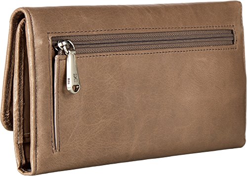 Beautifully mixing style and function, this classic Sadie Continental Wallet by Hobo transitions perfectly from day to night! This clutch wallet is made from top-grain genuine leather that has been extra tumbled for a unique, broken-in vintage look. The fully lined interior features 7 card slots, 3 bill pockets, 1 slip pocket, 1 clear ID window, and an attached key ring. A strong magnetic closure keeps this bag secure while an on the go coin pouch is placed on the outside for quick access. Measures 8.75" x 4" x 1", folds out to 11" wide.Feature