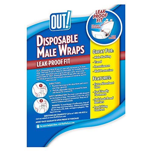 -. Feature : OUT! Disposable Male Wraps (12 ct) are specifically designed to fit male dogs with a 14 in - 19 in waist / Designed with a soft, leak-proof fit with adjustable, fur-friendly fasteners and a super absorbent core to give your pet a secure and comfortable fit / Perfect for male dogs with incontinence, male marking issues, and for travel / Simple and easy to use