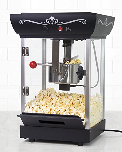 -. Feature : Makes up to 10-cups of popcorn per batch / Large 2.5-ounce stainless steel kettle with built-in stirring system / Tilt door for easy serving access / Tempered glass windows and door / Lighted interior