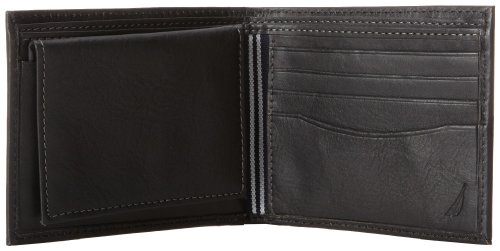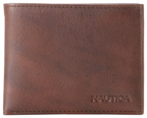 Nautica Pennant passcase wallet with exterior blind stamp logo, bill compartments, four credit card pockets, extra storage compartments and removable pass