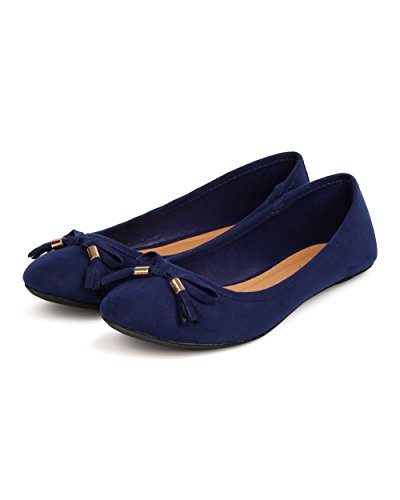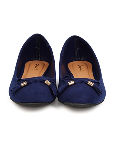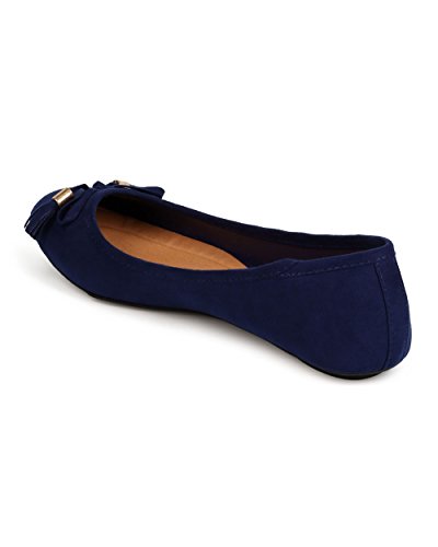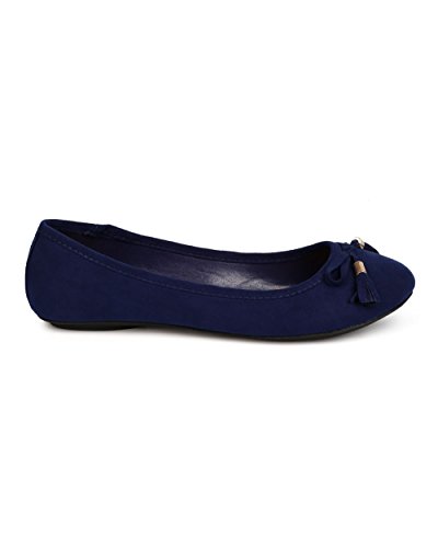 Qupid FC29 Women Faux Suede Round Toe Bow Tie Tasseled Ballerina Flat - Navy