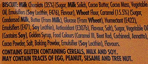 原材料:砂糖、小麦粉、キャラメル(砂糖、加糖練乳、バター、ぶどう糖、食塩)、植物油、前粉乳、ココアバター、カカオマス、転化糖、ココア、食塩、着色料(カラメル、ビートレッド、コチニール、アナトー)、乳化剤、グリセリン、香料、酸化防止剤(ビタミンE)、膨張剤、(原材料の一部に大豆を含む)