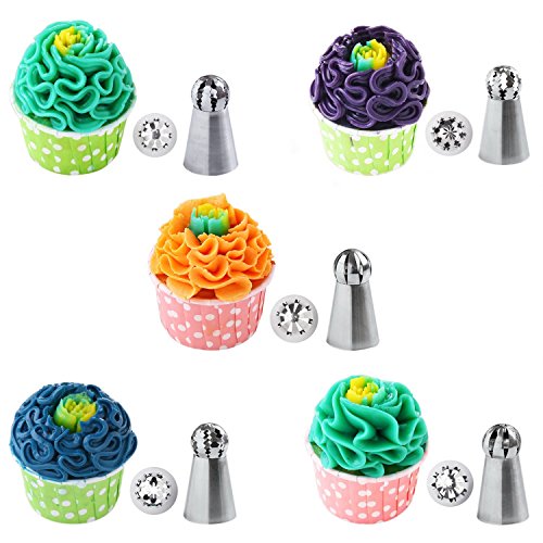 - ✔ 14PCS PIPING TIPS SET - This kit includes 10 X Russian Ball Piping Tips, 1 X Reusable Silicone Pastry Bag, 2 X Three-Piece Coupler, and 1 X plastic storage box. The coupler allows you to attach 1,2,or 3 piping bags, which allows that this coupler up to three colors to flow through the piping tip at a time.