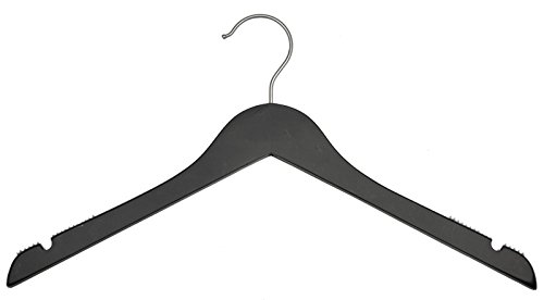 -. Feature : 17" hanger for blouses, shirts, jackets, and other garment tops / Wood with low-gloss black finish for strength and durability / Flat 1/2" thick profile to help minimize space required for hanging garments / Grippers on top of each arm for helping prevent garments from slipping off / Notch on top end of each arm for holding string straps