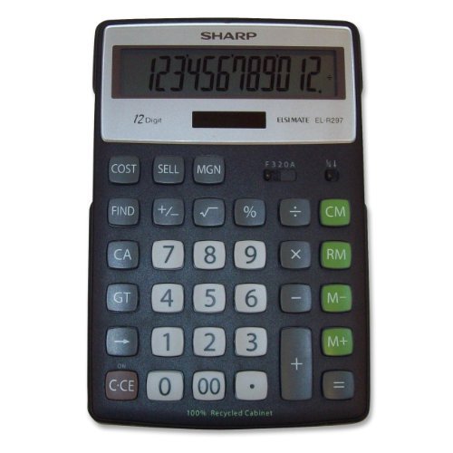 The Sharp ELR297BBK is a semi-desktop calculator featuring a 100 percent recycled cabinet, slanted 12-digit LCD screen and a kickstand. Other functions include a four-key memory, a grand total function, double-zero, cost/sell/margin functions, sign change, and a percent key. Its large keys and easy-to-read LCD screen make this calculator a quick and convenient machine. With its dual power feature, the ELR297BBK will automatically switch from solar to battery power in low light and from battery to solar power when low on batteries. Use this versatile and convenient semi-desktop calculator at home or at the office.Feature
