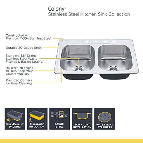 American Standard 20SB.8252283S.075 Colony Top Mount 25x22 single Bowl Stainless Steel 3-Hole Kitchen Sink