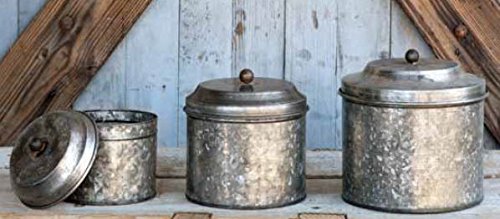 An antique inspired set of three galvanized tin canisters are a great addition to the kitchen or laundry. Set of three. Large: 7.5" x 7.5", medium: 6.5" x 6.5" and small: 5.5" x 5.5". (Canisters DO NOT have airtight seals)