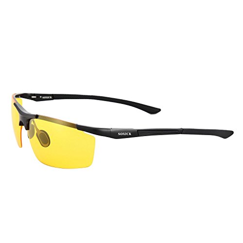 -. Feature : Soxick polarized lenses can filter out high-glare light from oncoming headlights, street, and other reflective surfaces. These special lenses make colors clearer and objects brighter, so you can maintain your focus on the road. Yellow filter also helps to soften harsh, bright lights and relieve eye strain, so you can drive at night with more comfort. / How to tell if your glasses are polarized? 1.Put the glasses in front of a LCD screen and look through the lens. 2.Turn the glasses 45 degrees. 3.You will notice the color change from bright to dark or vise versa. The light should have been blocked or filtered out, which indicating that the lenses are Polarized. / Yellow (best tint for light enhancement) polarized lenses help eliminate reflected and scattered glares, enhance contrast in low light conditions by making the road brighter. / Aluminum-Magnesium Frame HD driving glasses: yellow lens is perfect for night vision which is ideal for using when motorcycling, cycling, night driving, running, fishing, racing, skiing, climbing, hiking, and other outdoor activities. / German Military Quality Guarantee; Please do not hesitate to contact us if you are not satisfied with this product. Soxick is dedicated to satisfy our esteemed customers. Our 45-day return policy and 180-day warranty guarantee the most pleasant shopping experience!