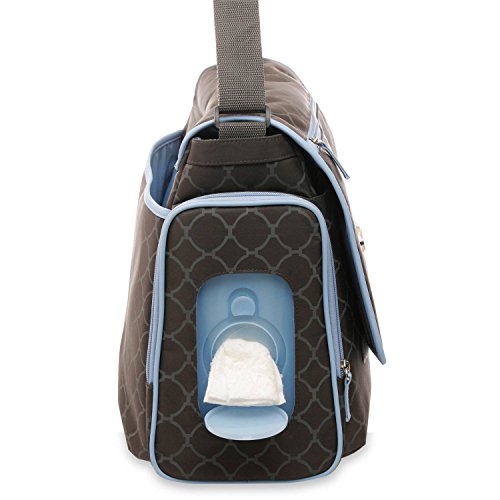 The Baby Boom Messenger Diaper Bag with Quick Find Organizer System is black with tonal geo print and blue trim.