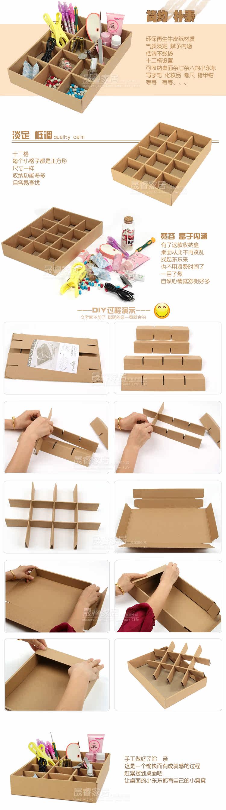 Kraft storage box, highly functional, 12 grid partition, can incorporate different small bits and pieces, such as mobile phones, baby toys, scissors, clips, keys, etc., so say goodbye to clutter your desktop, but also very easy to find items to good quality and good design, soft colors and amiable loved by everyone.