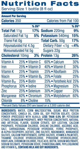- Feature : Case of four packages, each containing six 8-ounce bottles of nutrition drink (24 total bottles, 192 ounces) / Includes essential minerals and vitamins such as Vitamins A, B12, C, E and K; calcium; magnesium; iron; and zinc / Lactose free, low-cholesterol and low in saturated fat / Concentrated for gaining and maintaining healthy weight / Prodcut is of 8 Ounce; Winner of the 2007 ChefsBest Best Taste Award