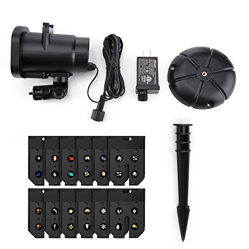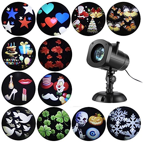 1,Beautiful & Unique design:12PCS switchable slides, heart shape, snowflake, clover, high heel, pigeon, skeleton, maple leaf, birthday cake, Santa, christmas tree, butterfly, star.The film pattern is projected on the wall, creating a dynamic pattern and the pattern is a rotational movement, different patterns, different themes to decorate the scene, the atmosphere even better.