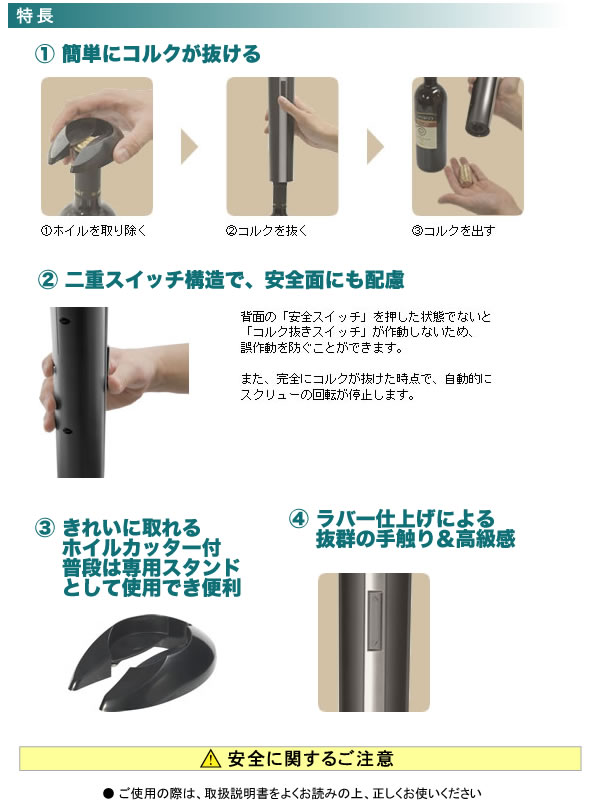 メディアでも紹介された、話題の電動ワインオープナー!ホイルを取り除く→コルクを抜く→コルクを出すの簡単3STEP♪二重スイッチ構造で、安全面にも配慮しました。