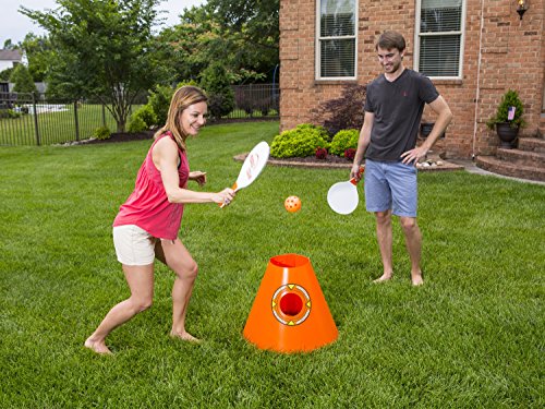 Teams of two face off to serve, assist and ZLAM the ball into the goals on the cones with the paddles