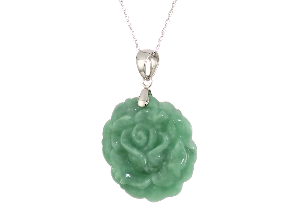 Rhodium plated Sterling Silver necklace featuring a Jade pendant hand carved in to a rose shape