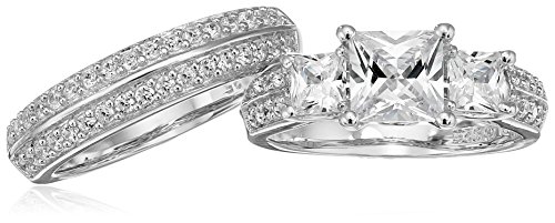 Brilliance abounds in this Sterling Silver Cubic Zirconia Ladies Ring Set in size 8. First off, it's impossible to miss the three princess-cut cubic zirconias that stand bright and prominent on this sterling silver two-ring set. If these stones are the stars of the show, then the supporting cast would be the chorus line of small round-cut cubic zirconias that encrust the second ring. The two rings come together for a glorious performance of dazzle and sparkle on your hand.Feature