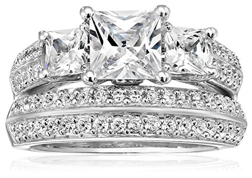 Sterling silver ring set featuring round- and princess-cut cubic zirconia with single stone accent on trellis setting