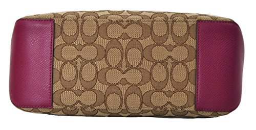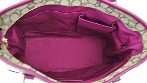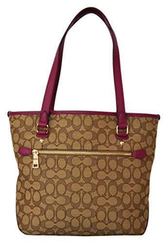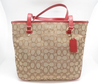 -. Feature : Signature jacquard with leather trim / Tope zipper closure; Gold-tone hardware / Back zipper pocket / Interior zip pocket & 2 slip pockets / Dimemsion: Top Width: 10"; Bottom Width; Height: 10.25"; Depth: 4"; Handle Drop: 8.5"