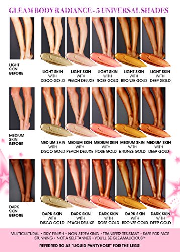 MOISTURIZING BODY MAKEUP: Natural oils, botanicals and a hydrating marine extract to enhance the elasticity, texture and vibrancy of skin. Transfer resistant, will not streak or stain the skin. Face - beautiful as a primer or mix with foundation. The 1 fl.oz. is a trial size, equates to the size of your first finger. Depending on desired the 1 fl.oz. may provide 1-3 body applications. If you are looking to use Body Radiance for legs and more body we recommend the 3.4 fl.oz. size.