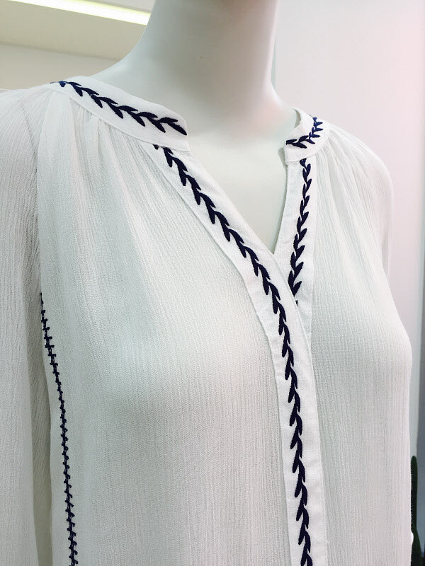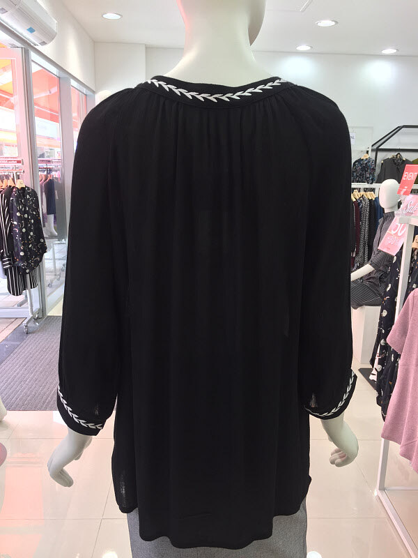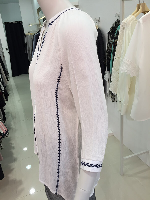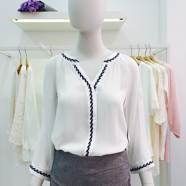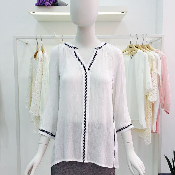 심플한 에스닉 넥 디자인으로 스커트나 슬랙스, 정장바지에 잘어울리며 봄 ,여름, 가을 편하게 입으실 수 있습니다.
