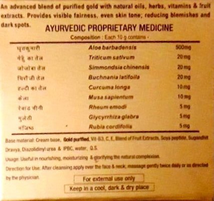 -. Feature : 1 Pack of 50g (1.75Oz) / Provides visible fairness, even skin tone, reducing blemishes and dark skin, useful in nourishing, moisturizing and glorifying natural complexion / This Patanjali cream has the following ingredients if you will look at it: Aloe vera Wheatgerm oil Mulethi Turmeric oil Chironji Manjistha Jojoba oil Purified gold along with fruit extracts, sugandhit draviya etc / This cream is suitable for all the skin type, this is because the major part of the cream is aloe Vera base. The Aloe Vera is a watery gel which is good for all the skin type